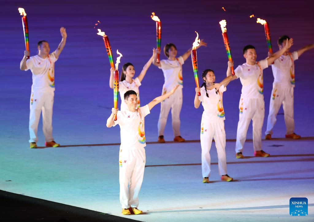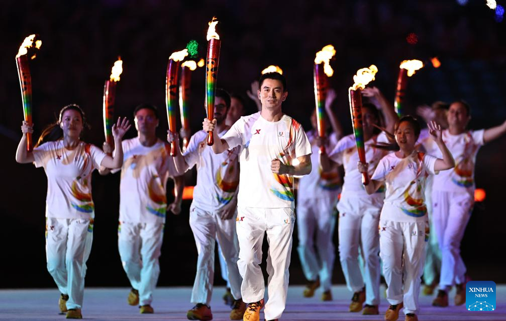 Torch bearers react during the opening ceremony of the 31st FISU Summer World University Games in Chengdu, southwest China's Sichuan Province, July 28, 2023. (Xinhua/Zhang Liyun)
