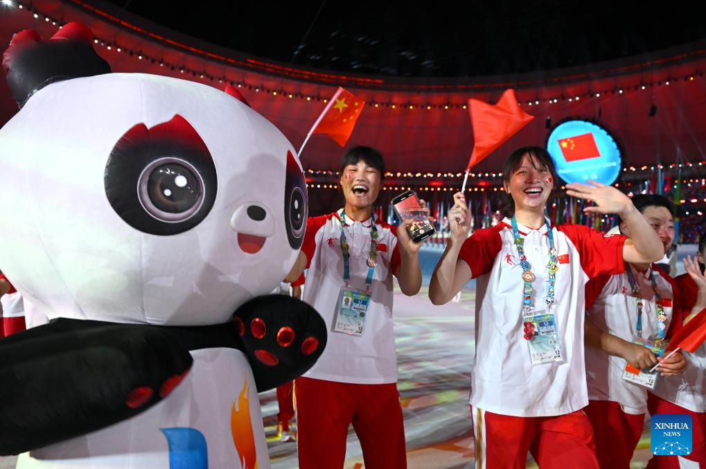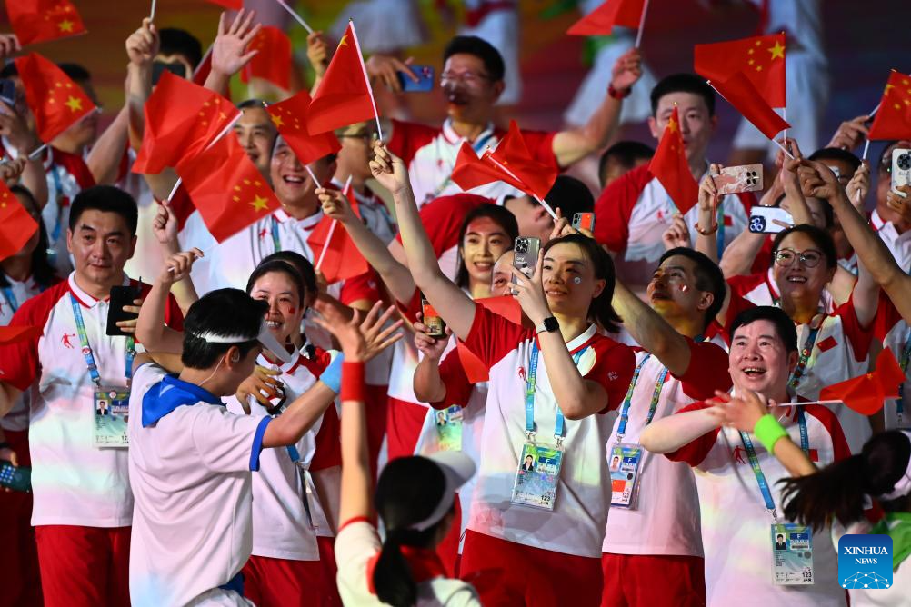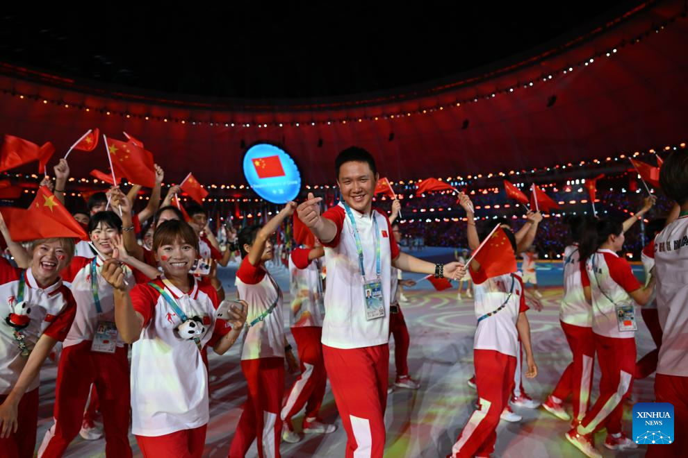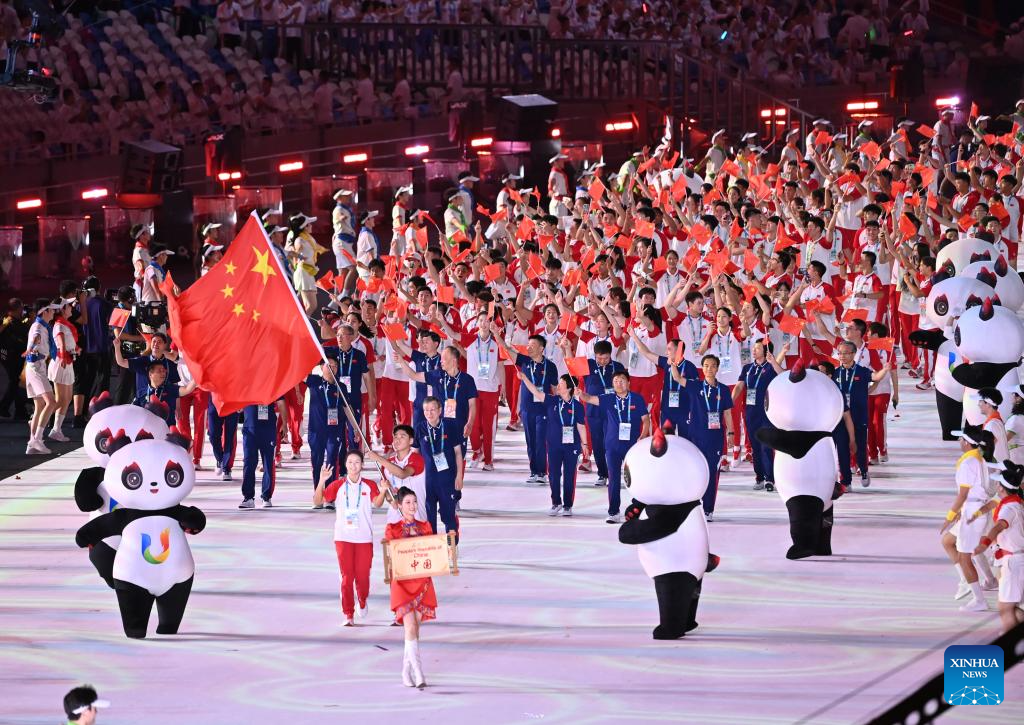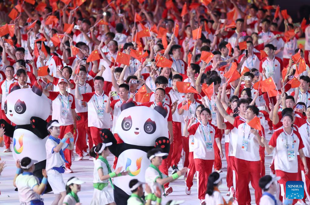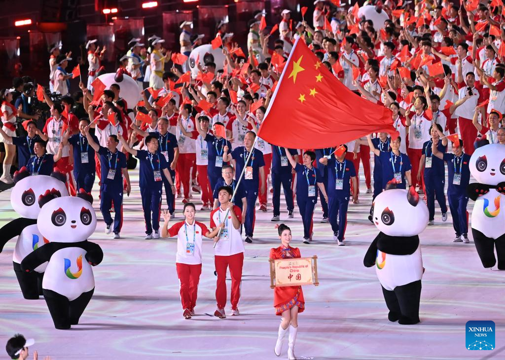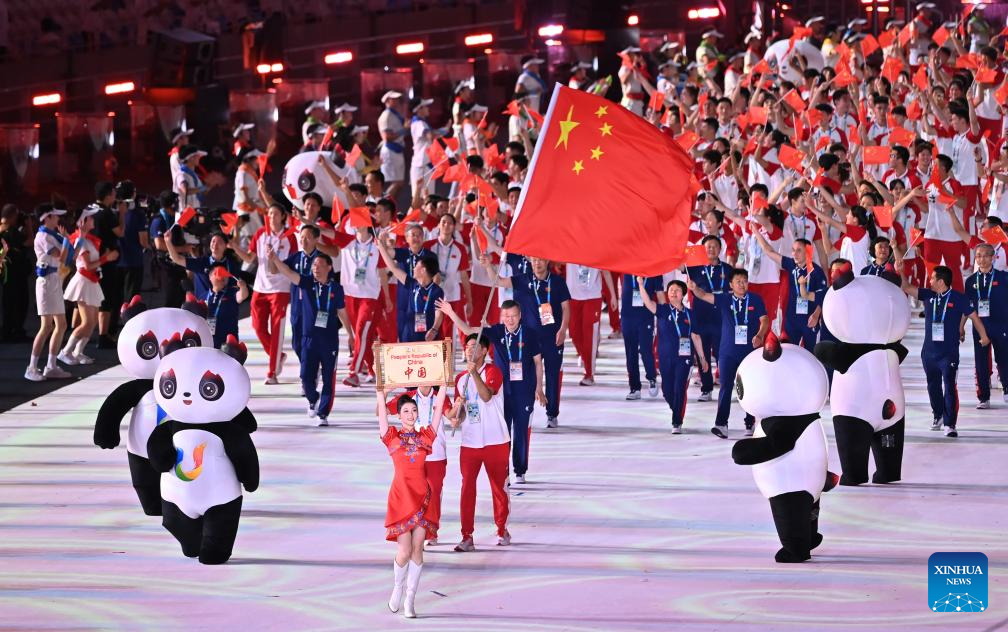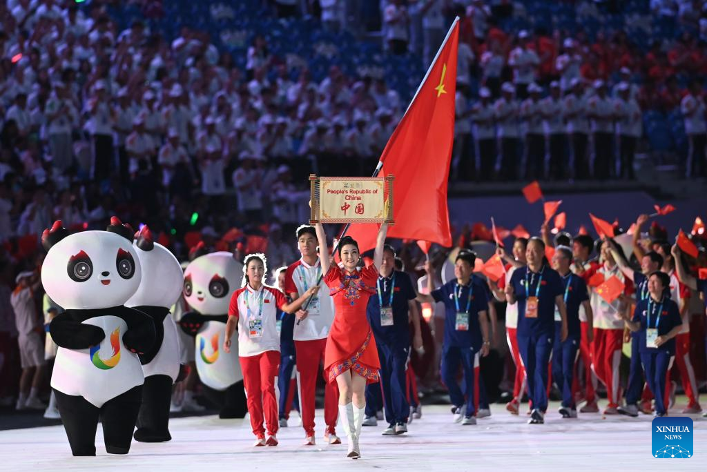 Members of China's delegation march during the opening ceremony of the 31st FISU Summer World University Games in Chengdu, southwest China's Sichuan Province, July 28, 2023. (Xinhua/Liu Kun)