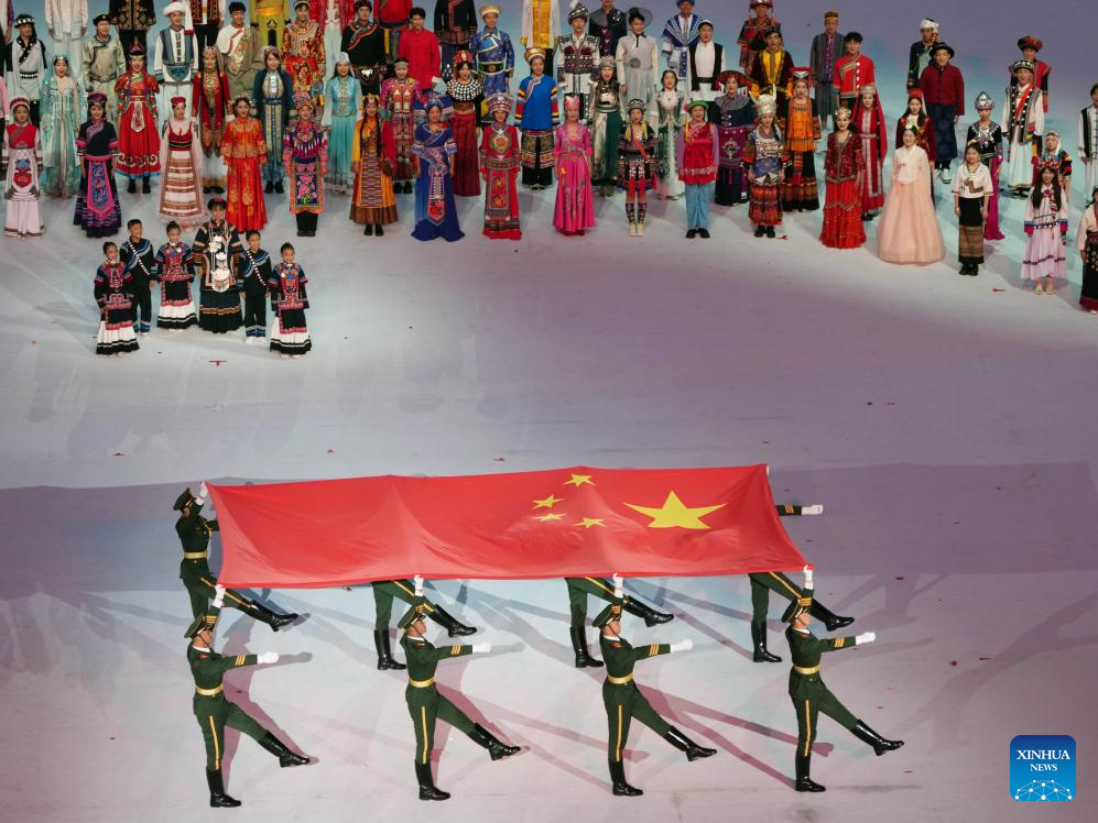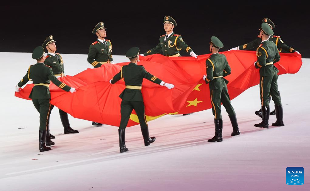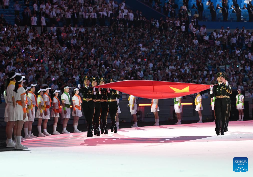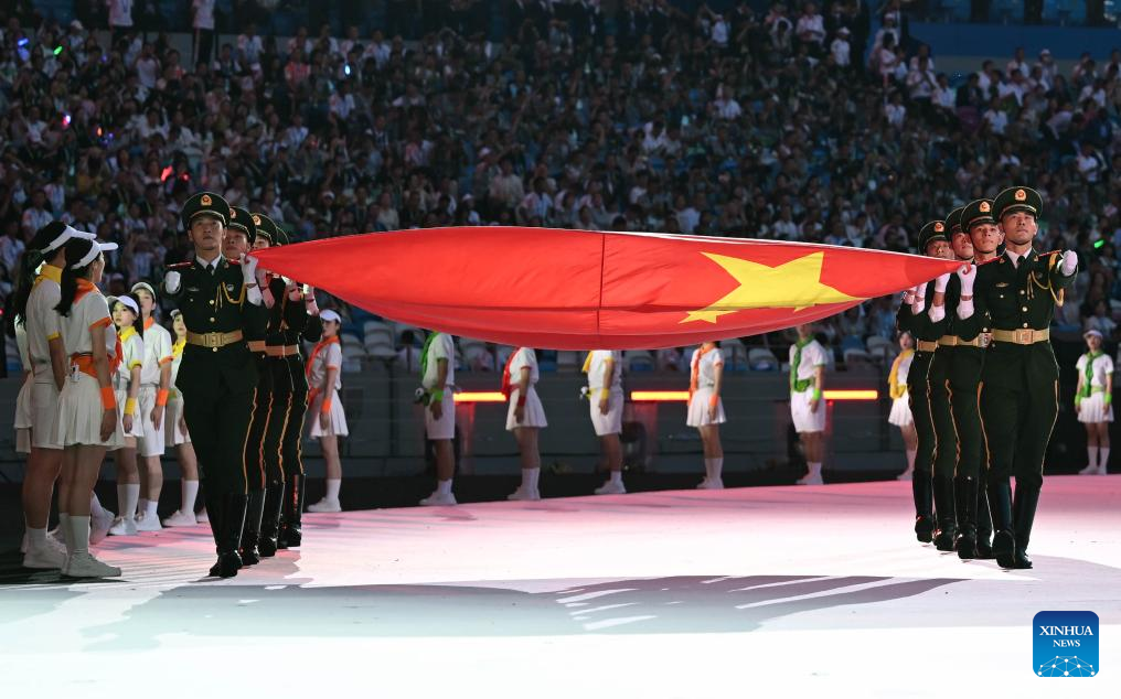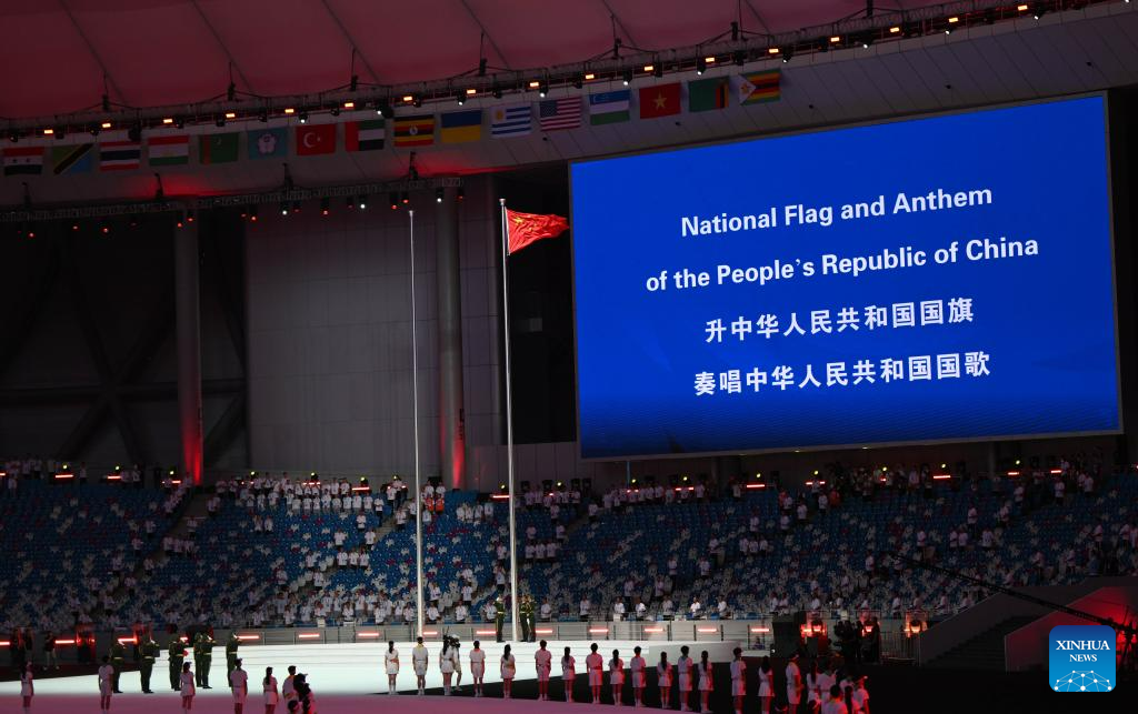 Chinese national flag is raised during the opening ceremony of the 31st FISU Summer World University Games in Chengdu, southwest China's Sichuan Province, July 28, 2023. (Xinhua/Li Xin)