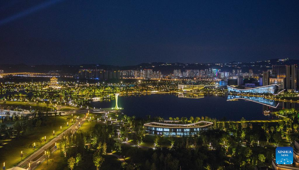 Dong'an Lake Sports Park is lighted during the opening ceremony of the 31st FISU Summer World University Games in Chengdu, southwest China's Sichuan Province, July 28, 2023. (Xinhua/Huang Wei)