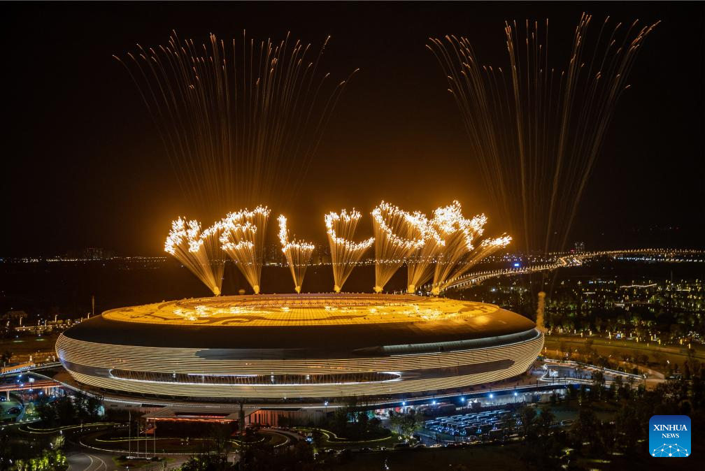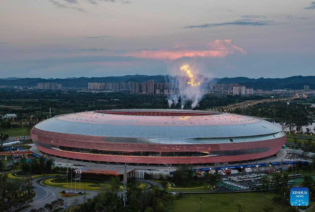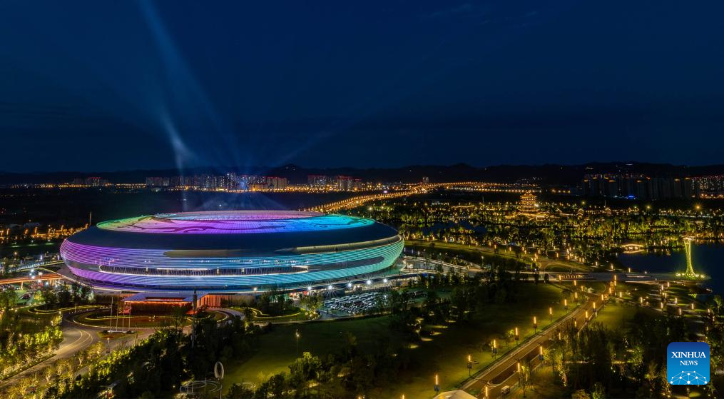 Main stadium in Dong'an Lake Sports Park is lighted during the opening ceremony of the 31st FISU Summer World University Games in Chengdu, southwest China's Sichuan Province, July 28, 2023. (Xinhua/Huang Wei)
