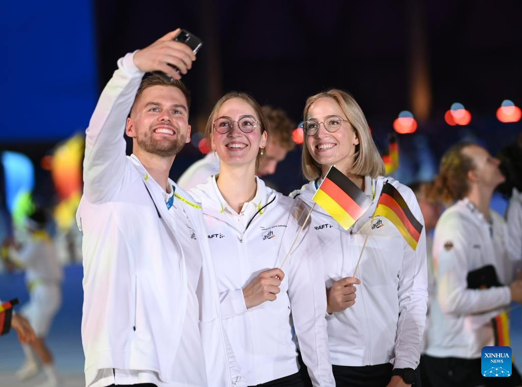 Members of Germany's delegation march during the opening ceremony of the 31st FISU Summer World University Games in Chengdu, southwest China's Sichuan Province, July 28, 2023. (Xinhua/Wang Xi)