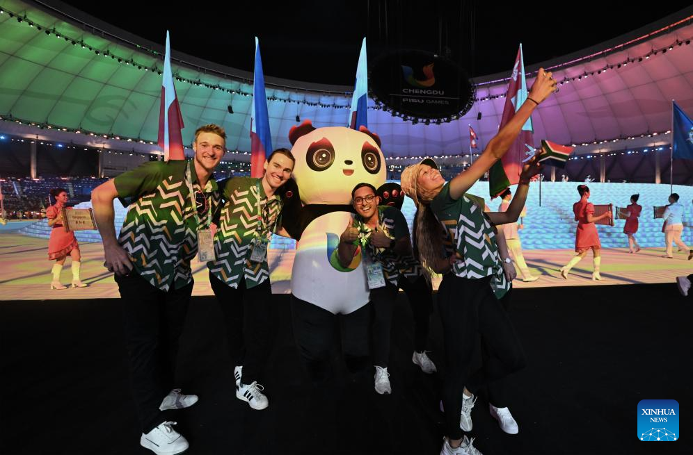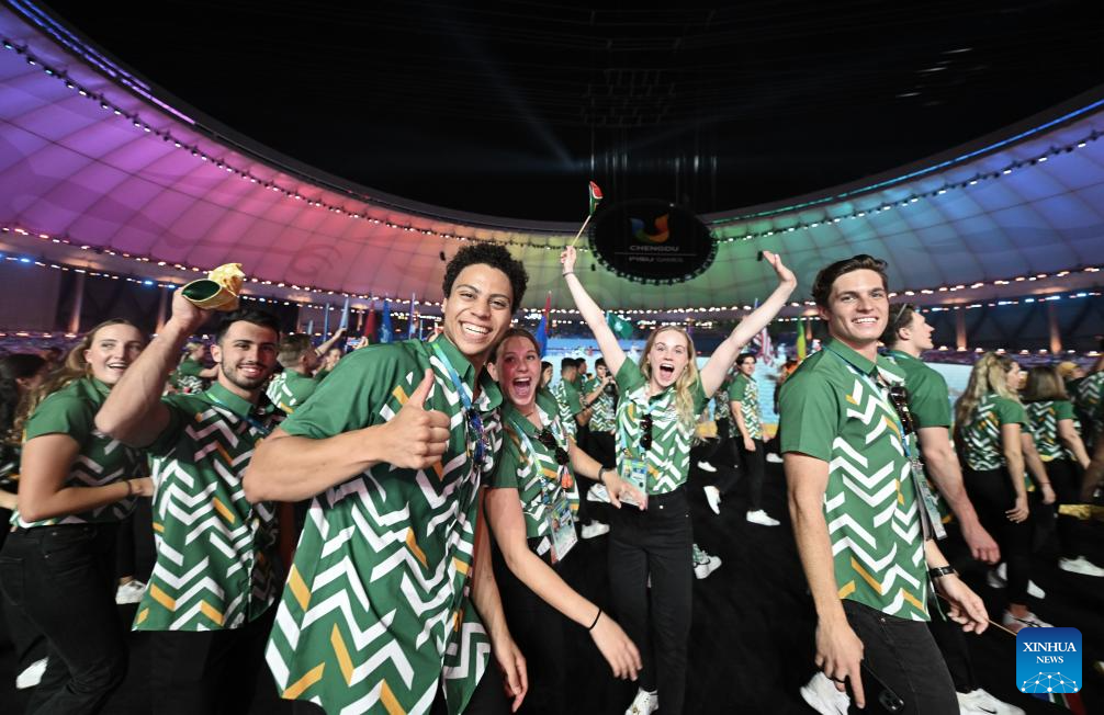 Members of South Africa's delegation march during the opening ceremony of the 31st FISU Summer World University Games in Chengdu, southwest China's Sichuan Province, July 28, 2023. (Xinhua/Xu Bingjie)