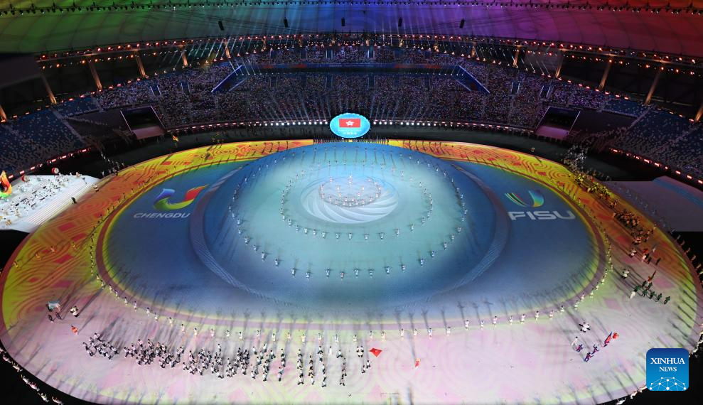 Members of delegation of China's Hong Kong march during the opening ceremony of the 31st FISU Summer World University Games in Chengdu, southwest China's Sichuan Province, July 28, 2023. (Xinhua/Wang Xi)