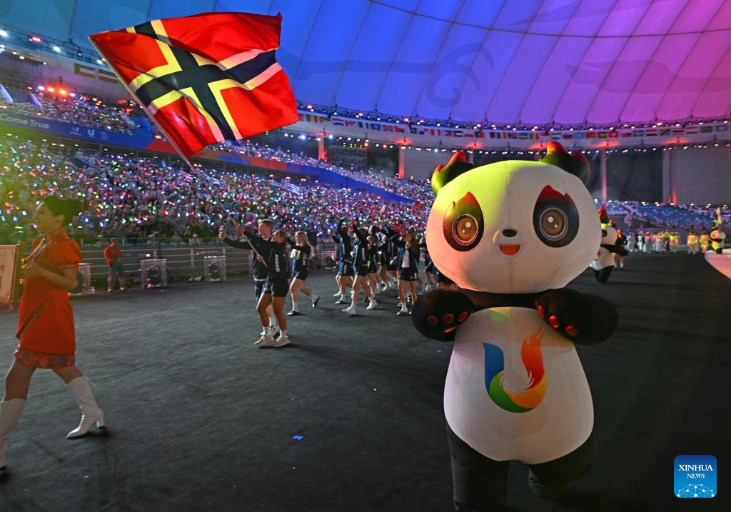 Members of Norway's delegation march during the opening ceremony of the 31st FISU Summer World University Games in Chengdu, southwest China's Sichuan Province, July 28, 2023. (Xinhua/Xu Bingjie)