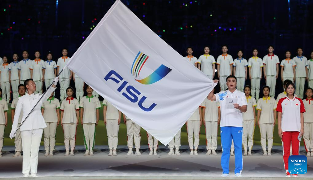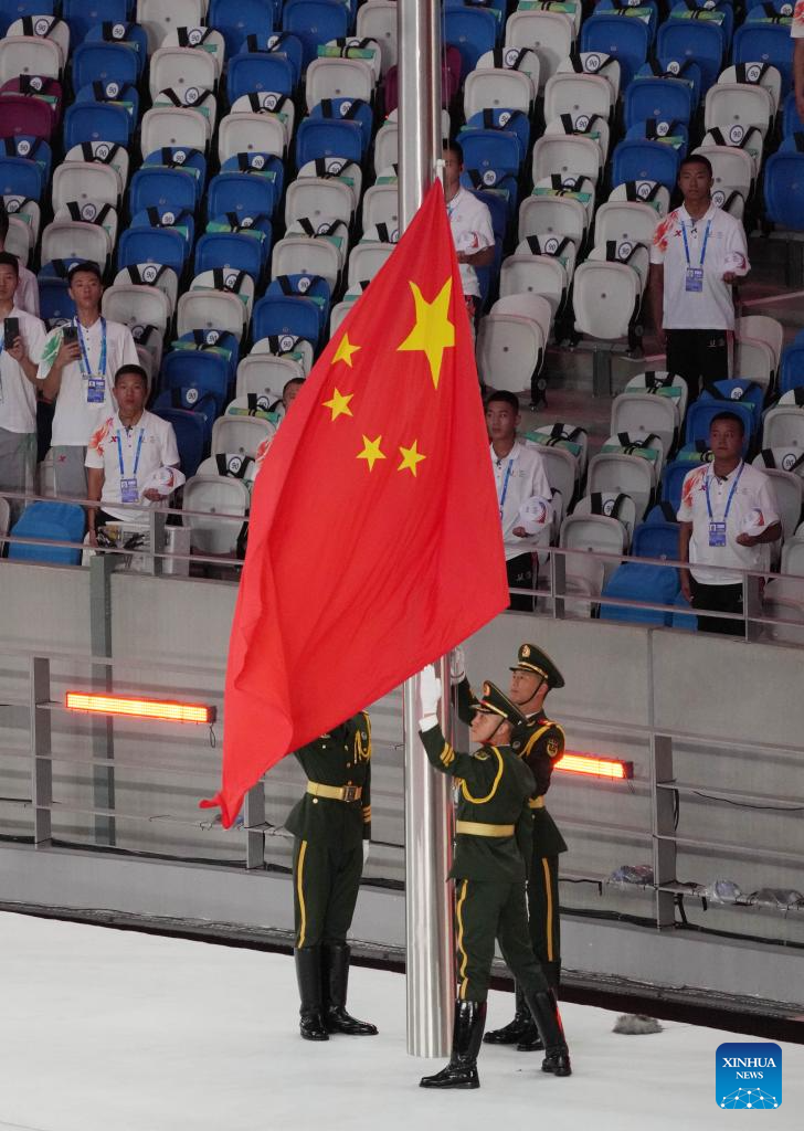 The Chinese national flag is raised during the opening ceremony of the 31st FISU Summer World University Games in Chengdu, southwest China's Sichuan Province, July 28, 2023. (Xinhua/Xu Bingjie)