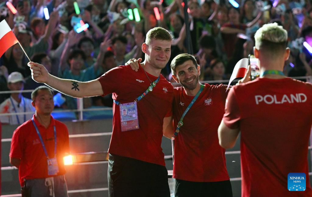 Members of Poland's delegation pose for photos during the opening ceremony of the 31st FISU Summer World University Games in Chengdu, southwest China's Sichuan Province, July 28, 2023. (Xinhua/Xu Bingjie)