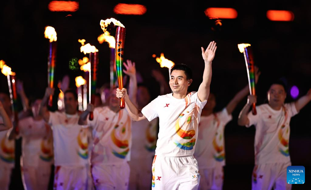 Torch bearer Ye Guangfu is seen during the opening ceremony of the 31st FISU Summer World University Games in Chengdu, southwest China's Sichuan Province, July 28, 2023. (Xinhua/Yang Qing)