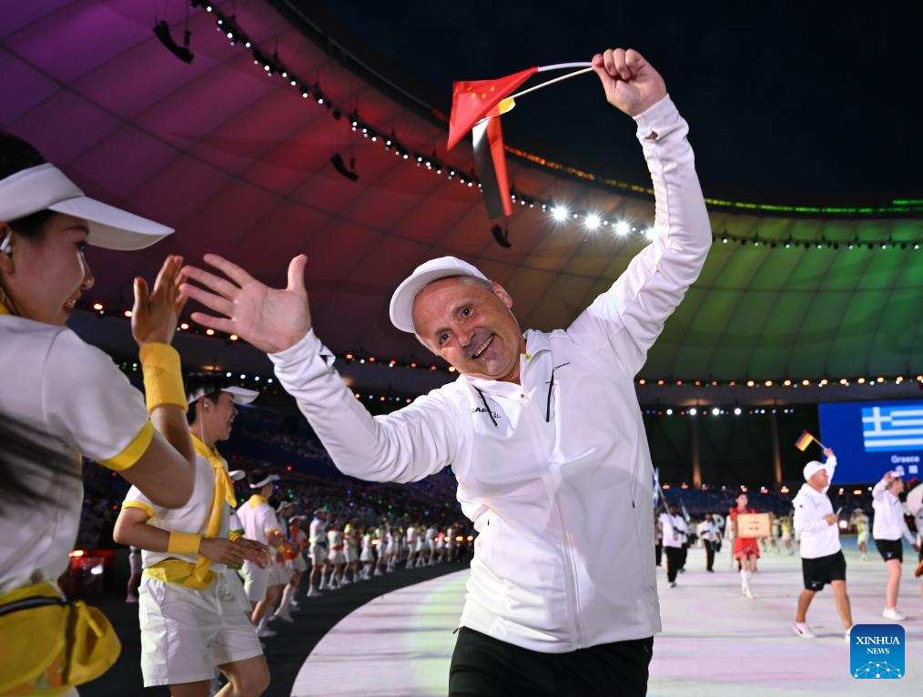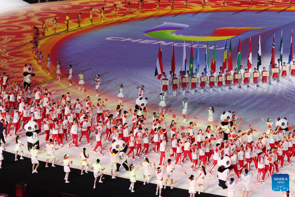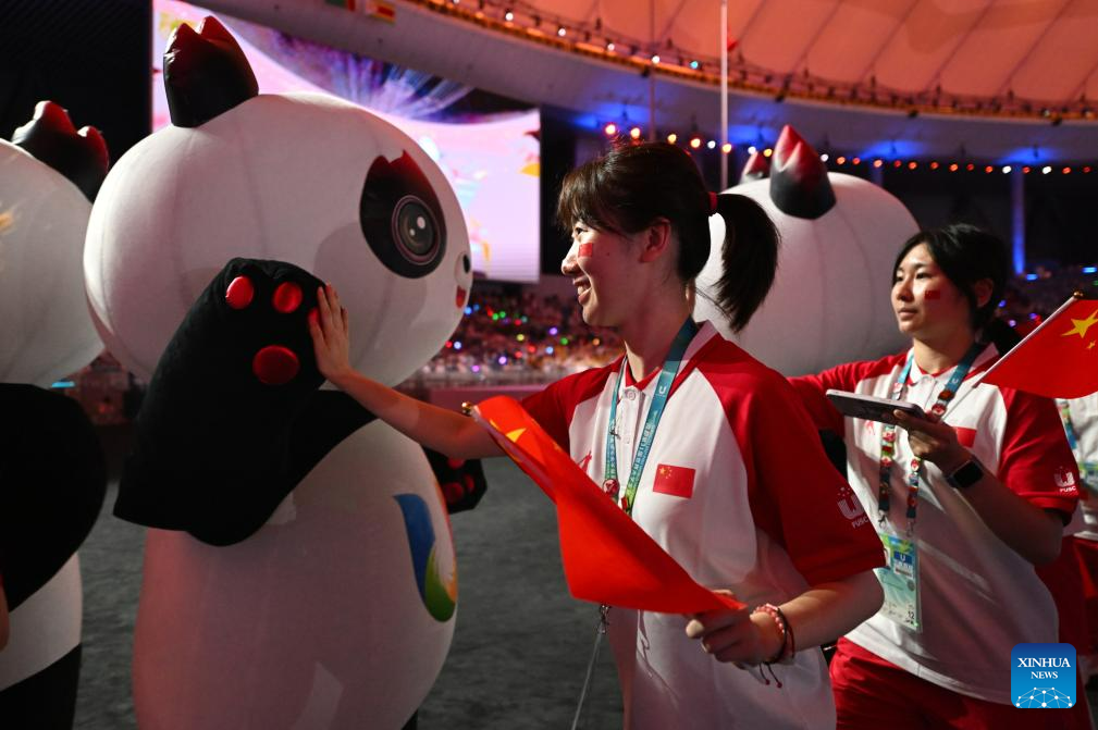 Members of China's delegation march during the opening ceremony of the 31st FISU Summer World University Games in Chengdu, southwest China's Sichuan Province, July 28, 2023. (Xinhua/Li Xin)