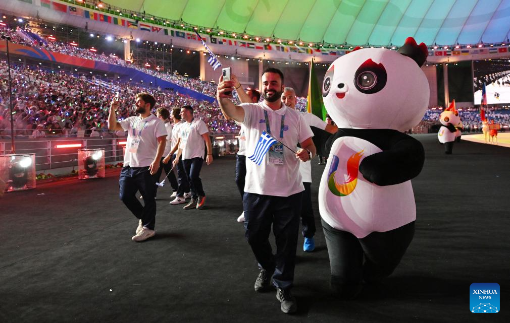 Members of Greece's delegation march during the opening ceremony of the 31st FISU Summer World University Games in Chengdu, southwest China's Sichuan Province, July 28, 2023. (Xinhua/Xu Bingjie)