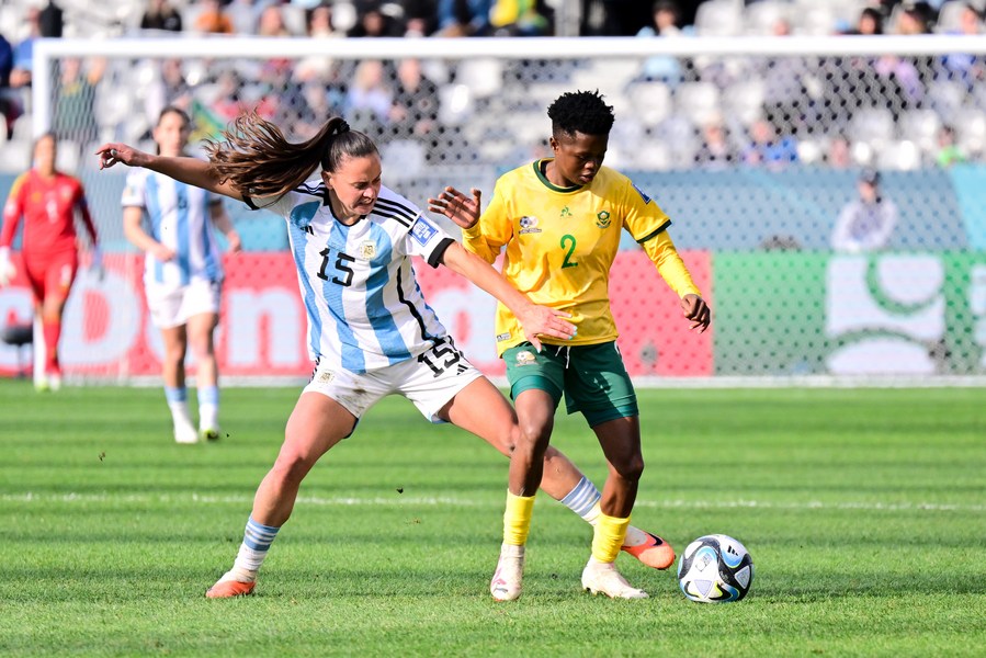 Florencia Bonsegundo (L) of Argentina vies with Labogang Ramalepe of South Africa during their Group G encounter at the 2023 FIFA Women's World Cup in Dunedin, New Zealand, July 28, 2023. (Xinhua/Zhu Wei)