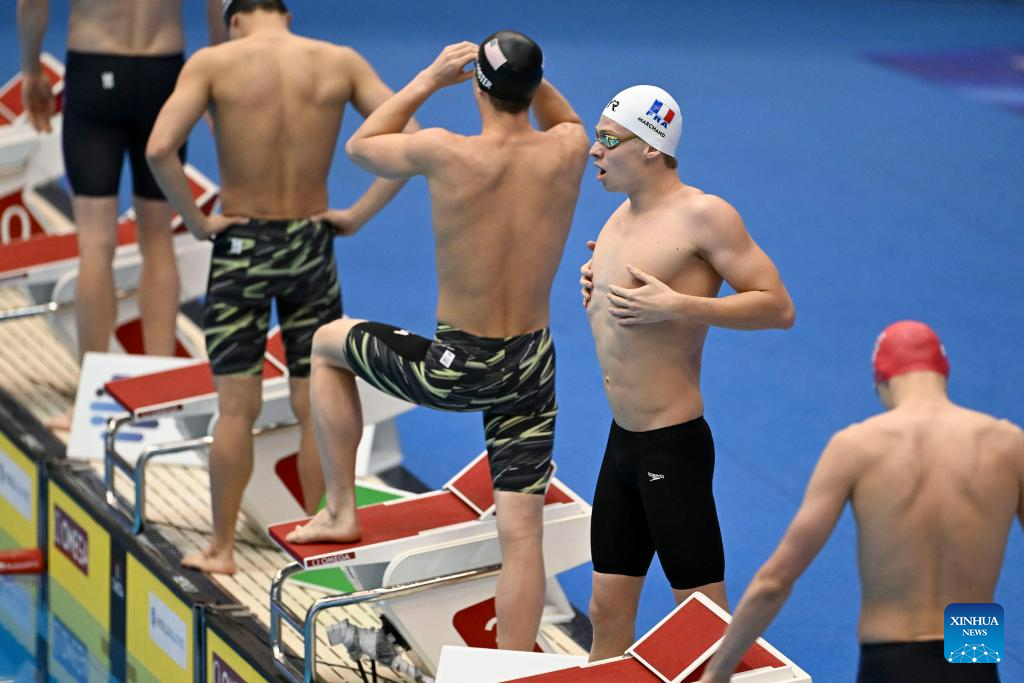 Leon Marchand (2nd R) of France reacts before the men's 200m medley final at the World Aquatics Championships in Fukuoka, Japan, July 27, 2023. (Xinhua/Xu Chang)