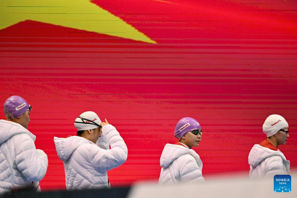 Li Bingjie, Li Jiaping, Ai Yanhan and Liu Yaxin (R to L) of China are seen before the women's 4x200m freestyle relay final at the World Aquatics Championships in Fukuoka, Japan, July 27, 2023. (Xinhua/Zhang Xiaoyu)