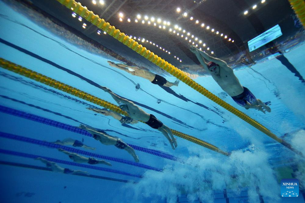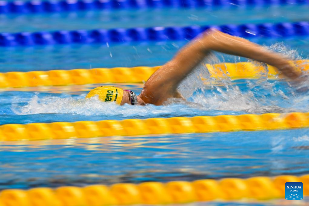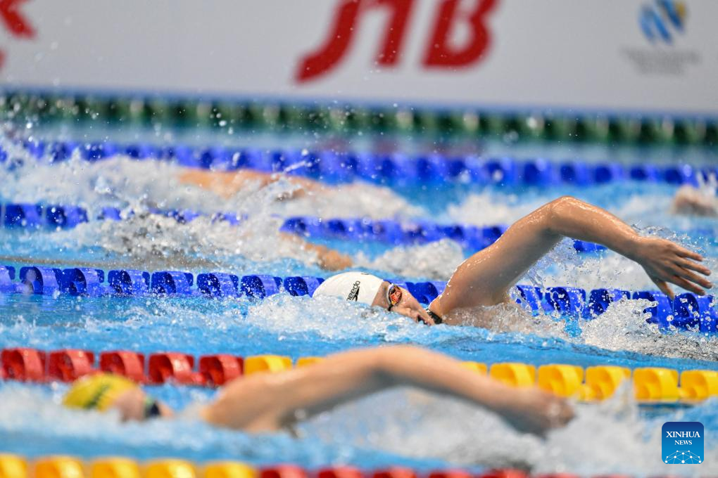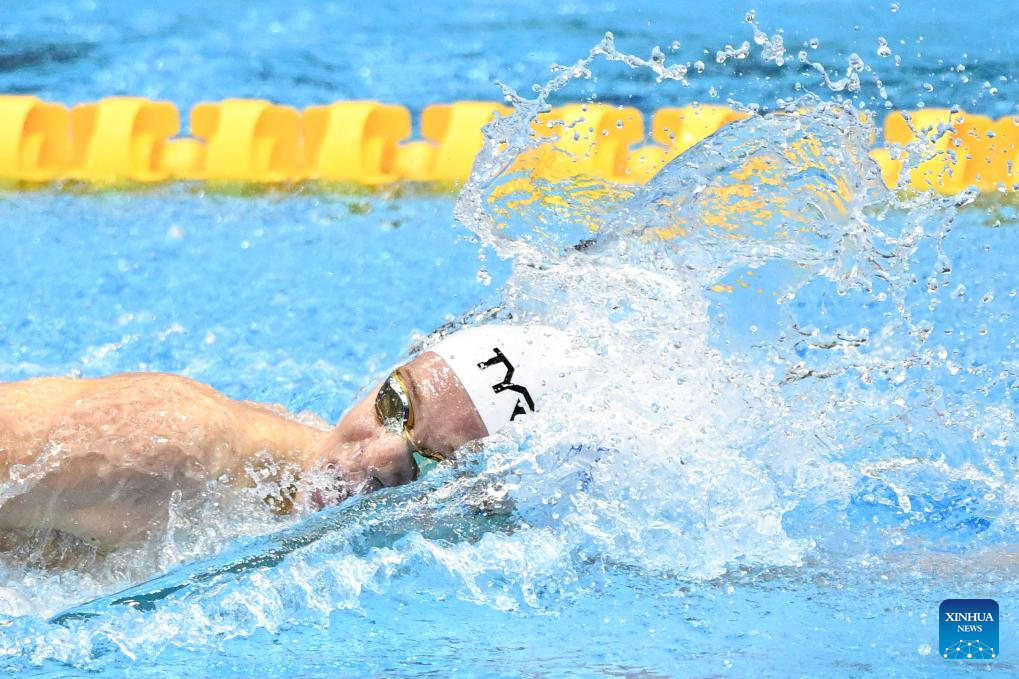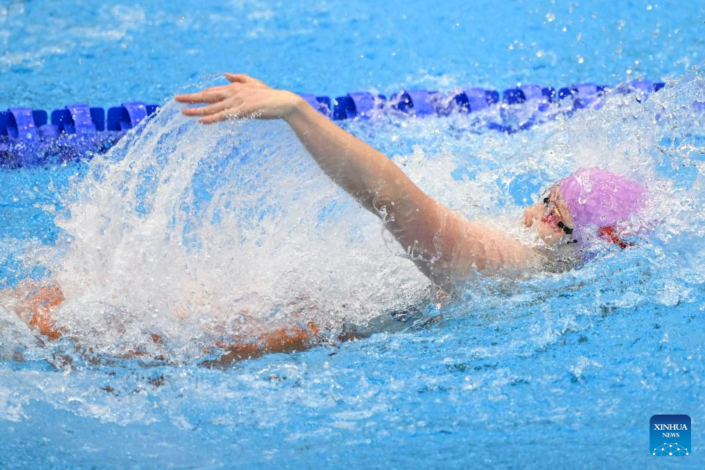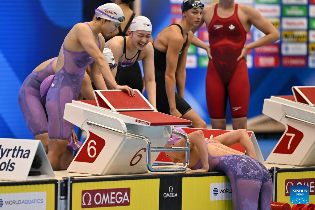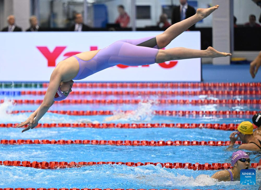 Li Bingjie of China competes during the women's 4x200m freestyle relay final at the World Aquatics Championships in Fukuoka, Japan, July 27, 2023. (Xinhua/Zhang Xiaoyu)