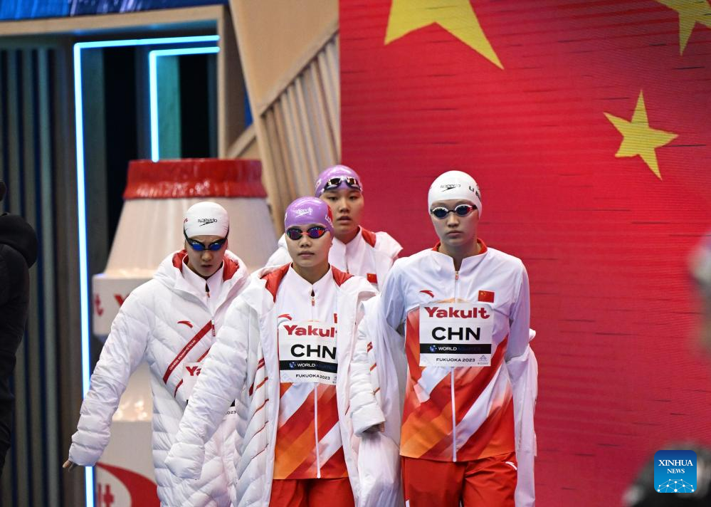 Team China react before the women's 4x200m freestyle relay final at the World Aquatics Championships in Fukuoka, Japan, July 27, 2023. (Xinhua/Xia Yifang)