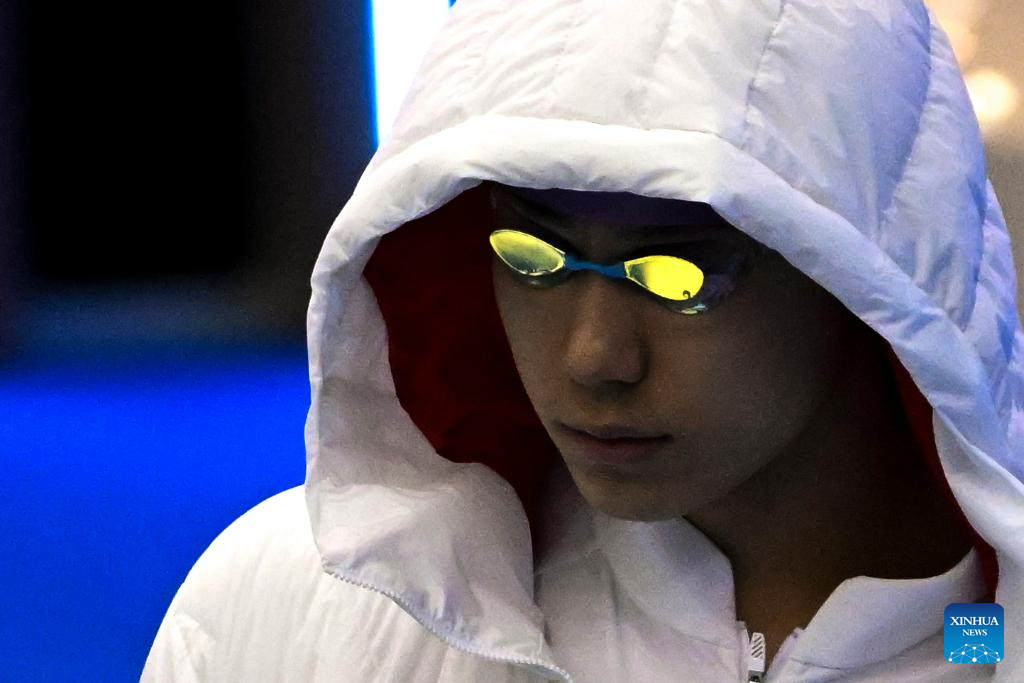 Qin Haiyang of China reacts before the men's 200m breaststroke semifinal at the World Aquatics Championships in Fukuoka, Japan, July 27, 2023. (Xinhua/Xu Chang)
