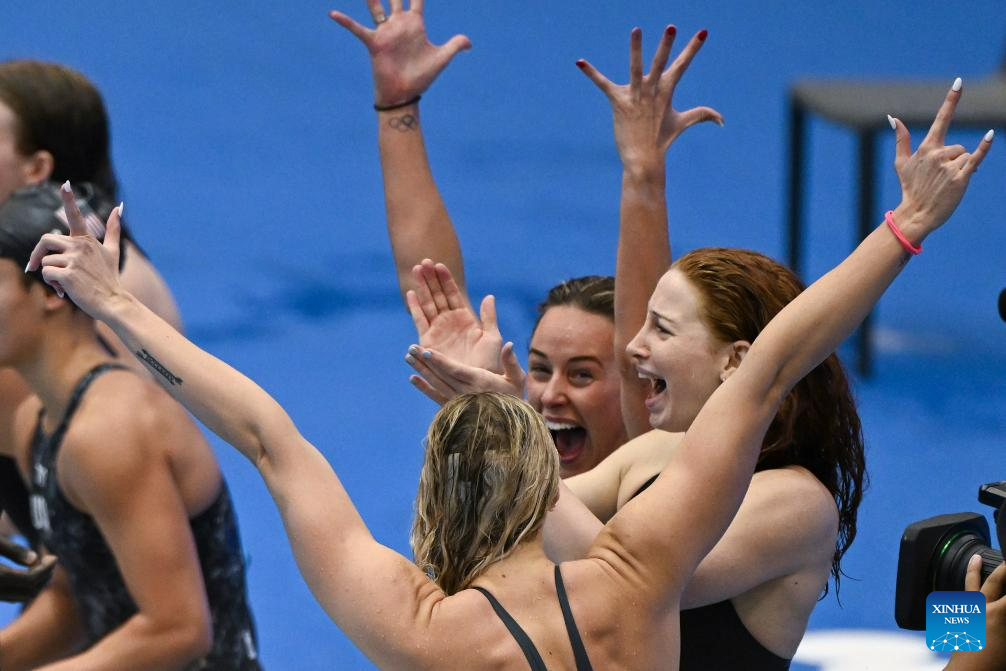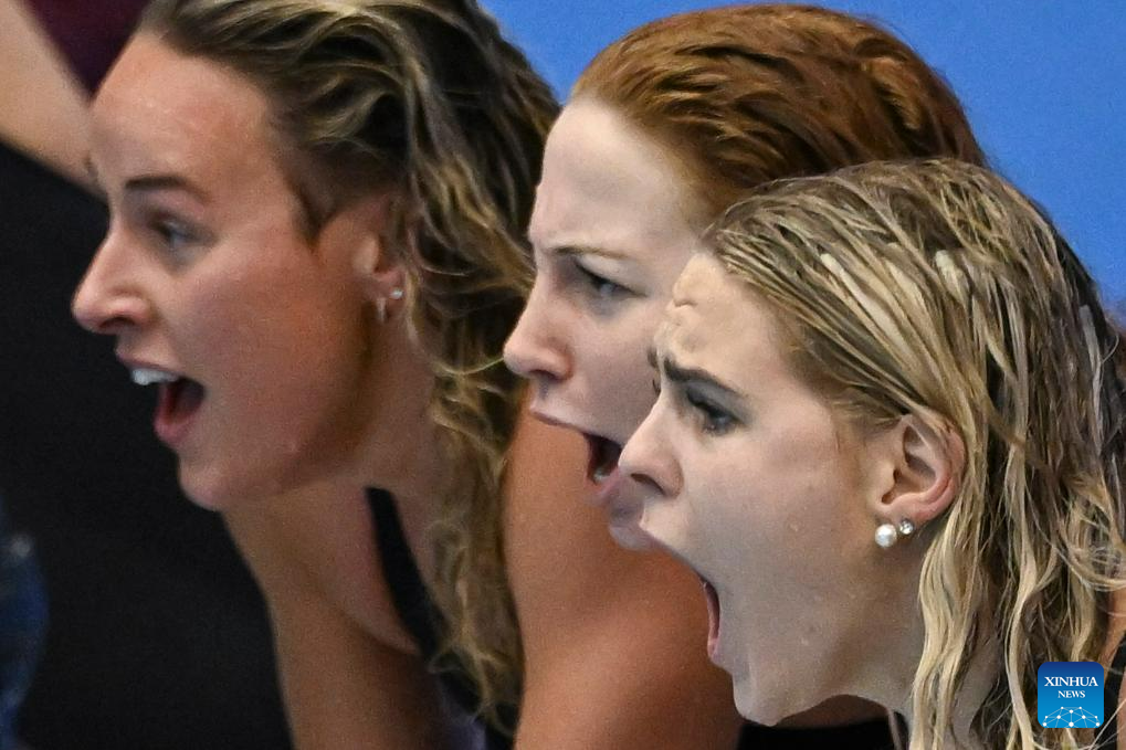 Members of Team Australia react during the women's 4x200m freestyle relay final at the World Aquatics Championships in Fukuoka, Japan, July 27, 2023. (Xinhua/Xu Chang)