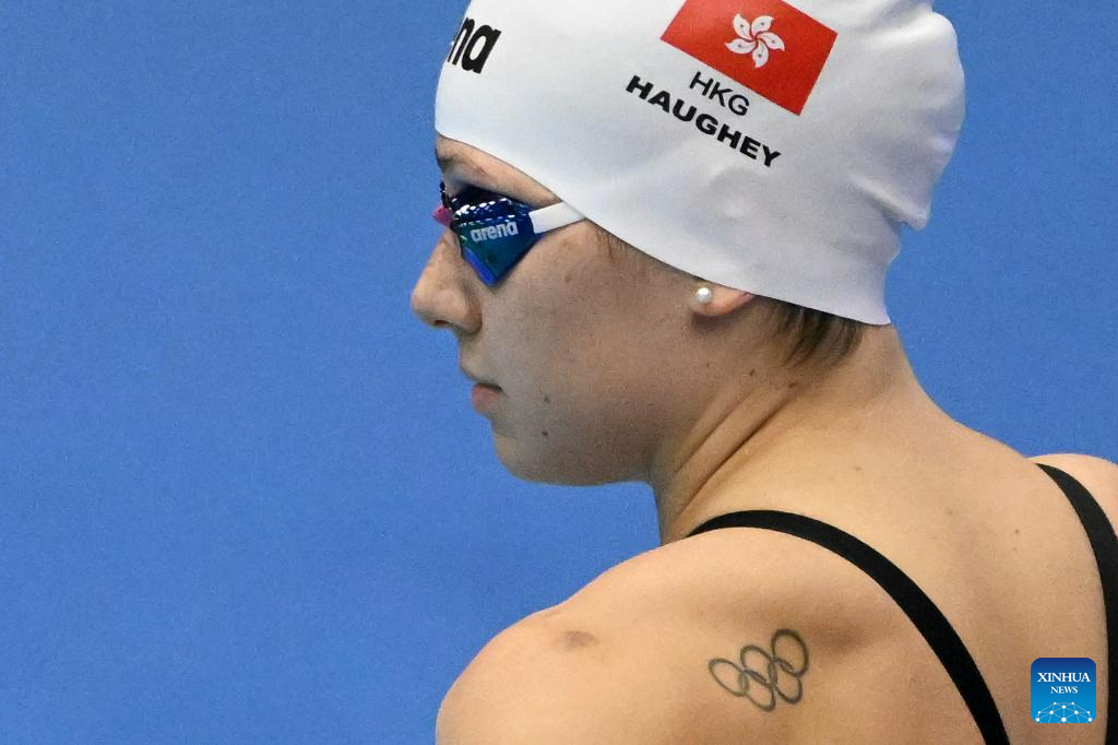 Siobhan Bernadette Haughey of China's Hong Kong reacts before the women's 100m freestyle semifinal at the World Aquatics Championships in Fukuoka, Japan, July 27, 2023. (Xinhua/Xu Chang)