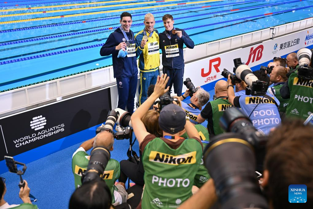 Silver medalist USA's Jack Alexy, gold medalist Australia's Kyle Chalmers and bronze medalist France's Maxime Grousset (L to R) pose after the men's 100m freestyle final at the World Aquatics Championships in Fukuoka, Japan, July 27, 2023. (Xinhua/Zhang Xiaoyu)