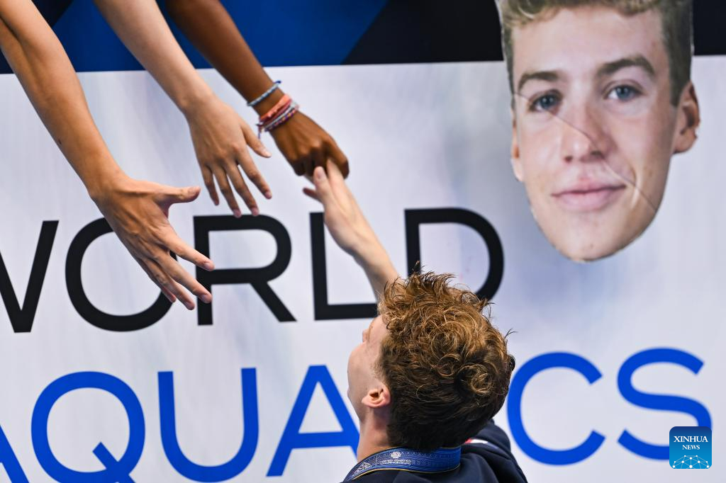 Gold medalist France's Leon Marchand signs for fans after the men's 200m individual medley final at the World Aquatics Championships in Fukuoka, Japan, July 27, 2023. (Xinhua/Zhang Xiaoyu)