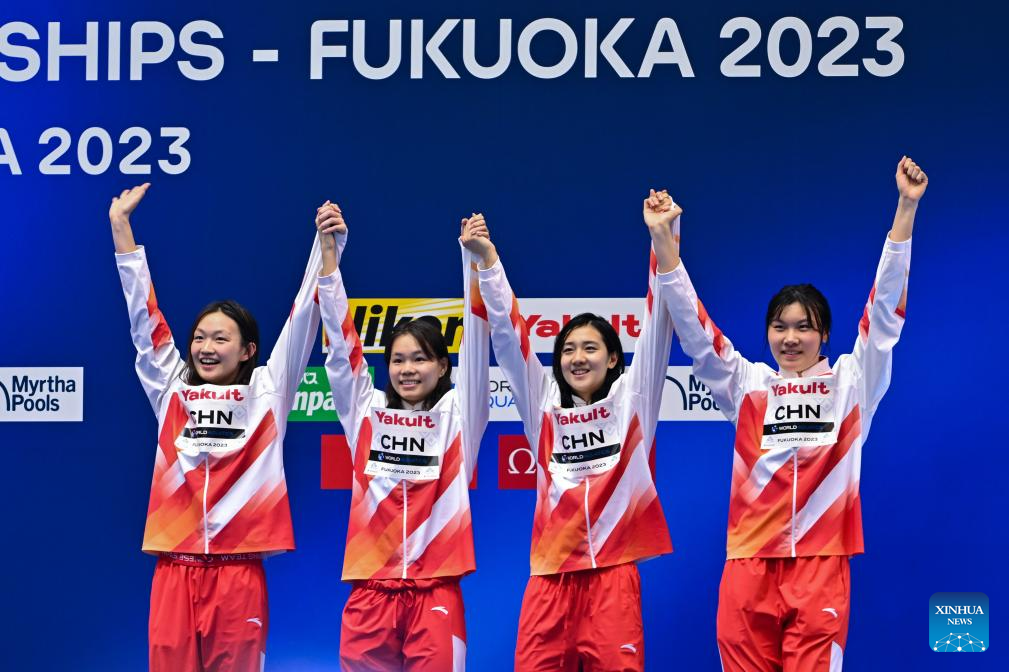 Li Bingjie, Li Jiaping, Ai Yanhan and Liu Yaxin (L to R) of China react during the awarding ceremony of the women's 4x200m freestyle relay at the World Aquatics Championships in Fukuoka, Japan, July 27, 2023. (Xinhua/Zhang Xiaoyu)