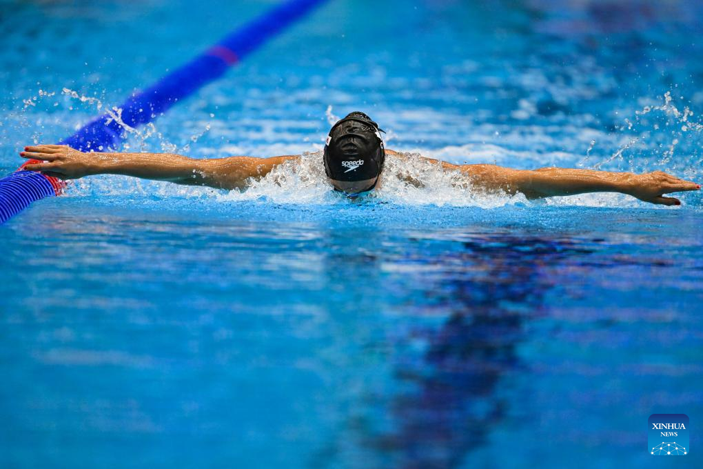 Leon Marchand of France competes during the men's 200m medley final at the World Aquatics Championships in Fukuoka, Japan, July 27, 2023. (Xinhua/Xu Chang)