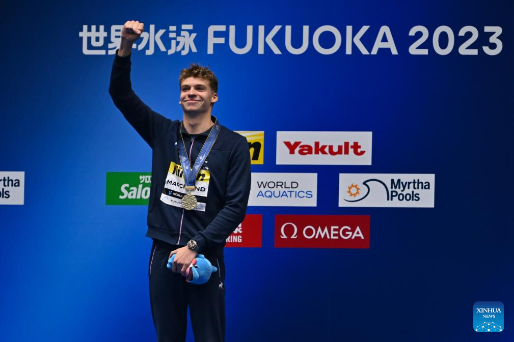 Gold medalist France's Leon Marchand poses following the medals ceremony for the men's 200m individual medley final at the World Aquatics Championships in Fukuoka, Japan, July 27, 2023. (Xinhua/Zhang Xiaoyu)