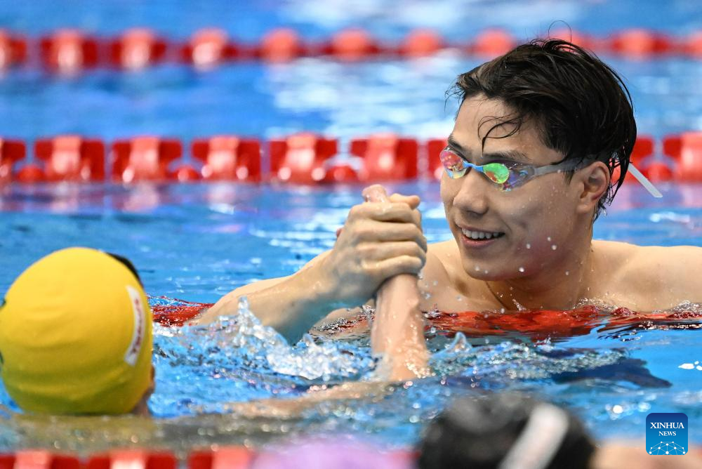 Qin Haiyang (R) of China shakes hands with Zac Stubblety-Cook of Australia after the men's 200m breaststroke semifinal at the World Aquatics Championships in Fukuoka, Japan, July 27, 2023. (Xinhua/Xia Yifang)