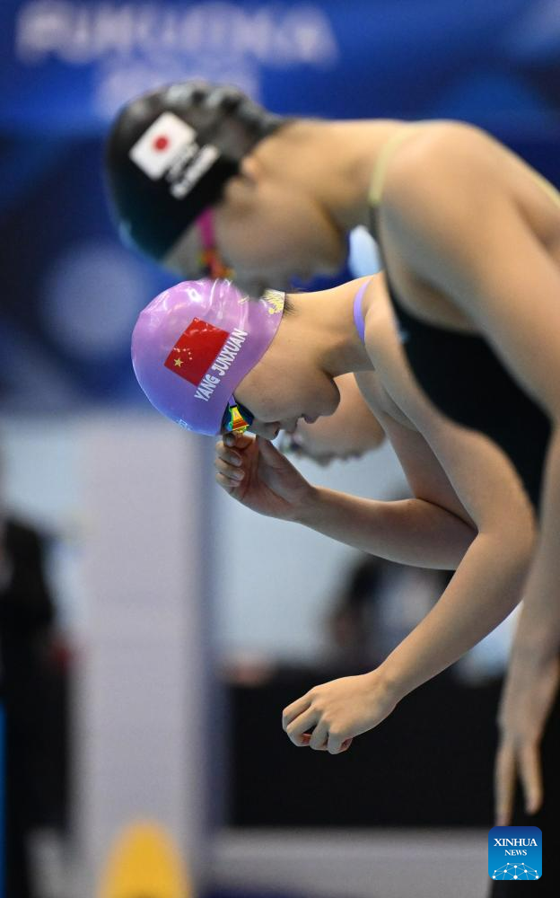 Yang Junxuan of China reacts before the women's 100m freestyle semifinal at the World Aquatics Championships in Fukuoka, Japan, July 27, 2023. (Xinhua/Xia Yifang)