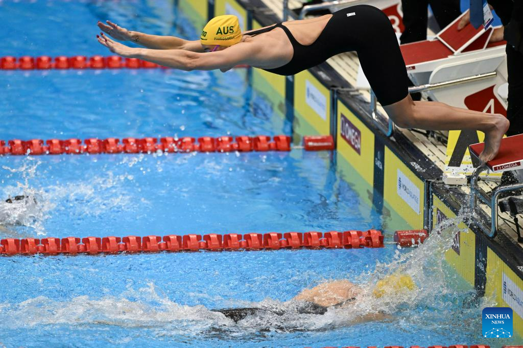 Brianna Throssell of Australia competes during the women's 4x200m freestyle relay final at the World Aquatics Championships in Fukuoka, Japan, July 27, 2023. (Xinhua/Zhang Xiaoyu)