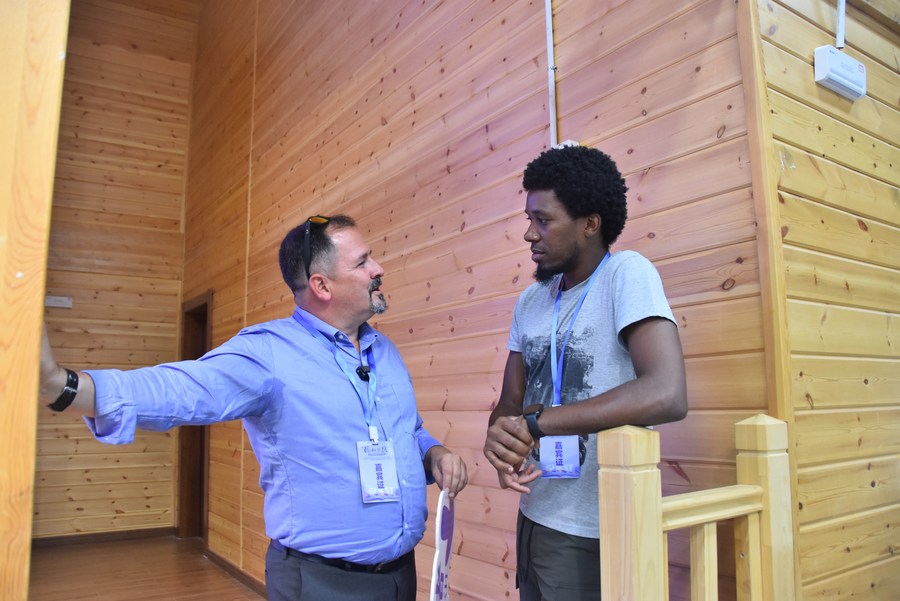 Fernando Munoz Bernal (L) talks with a student in Karamay, northwest China's Xinjiang Uygur Autonomous Region, July 20, 2023. (Xinhua/Gu Yu)