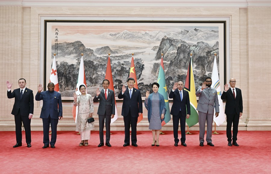 Chinese President Xi Jinping and his wife Peng Liyuan pose for a group photo with guests during a welcoming banquet ahead of the opening ceremony of the 31st summer edition of the FISU World University Games in Chengdu, capital city of southwest China's Sichuan Province, July 28, 2023. (Xinhua/Zhang Ling)