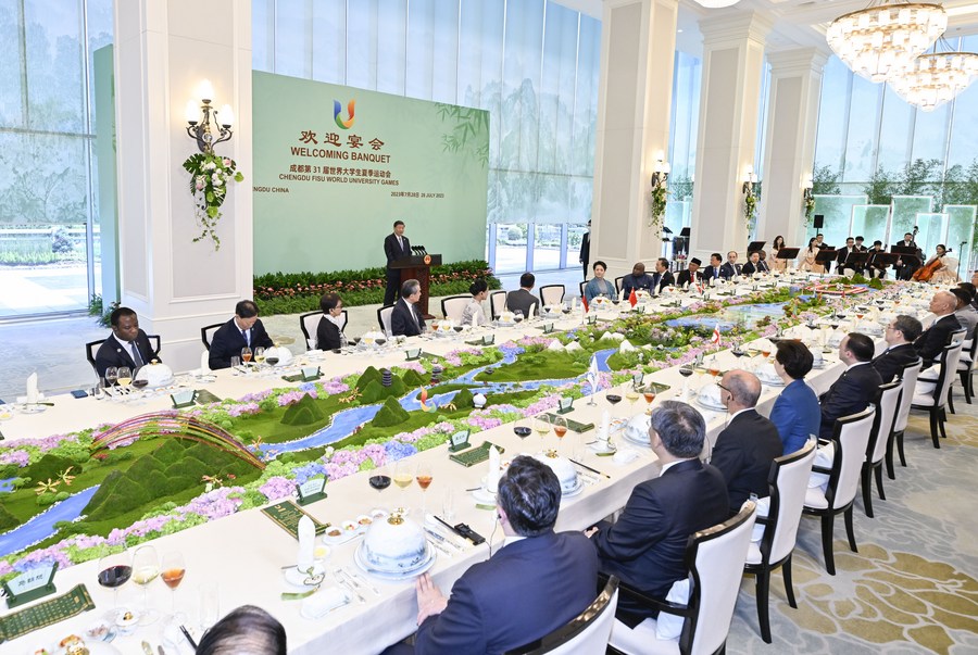 CHENGDU, July 28 (Xinhua) -- Chinese President Xi Jinping and his wife Peng Liyuan on Friday hosted a banquet in Chengdu to welcome guests attending the opening ceremony of the Chengdu FISU World University Games.