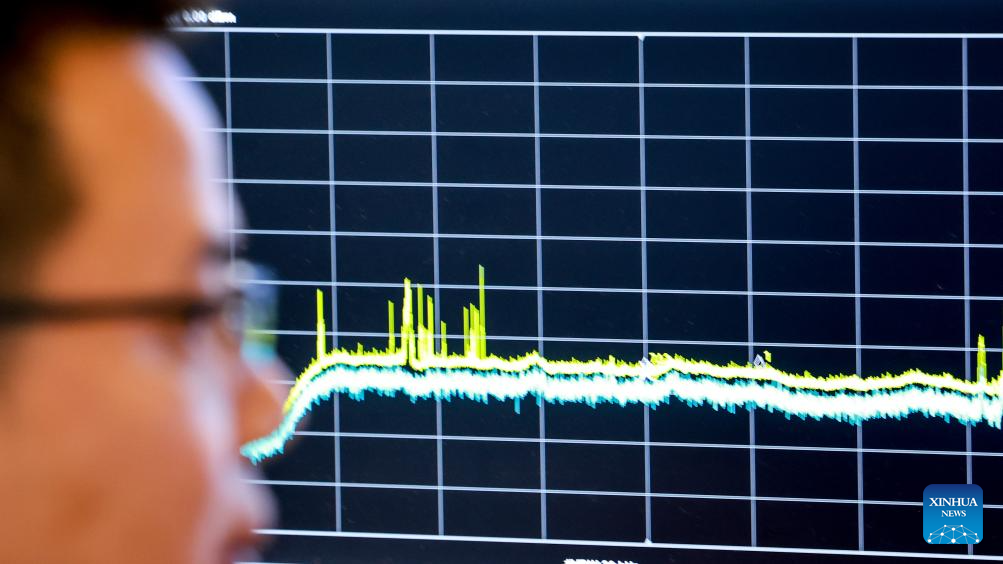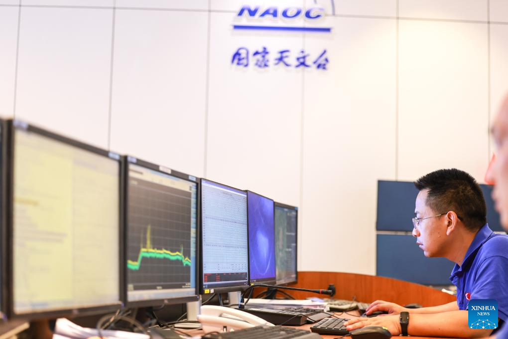 A staff member works at the control room of China's Five-hundred-meter Aperture Spherical Radio Telescope (FAST) in Pingtang County, southwest China's Guizhou Province, July 25, 2023. An international research team led by Chinese astronomers revealed the complex dynamic features of relativistic jets of a black hole, according to a study published in the journal Nature. (Xinhua/Ou Dongqu)