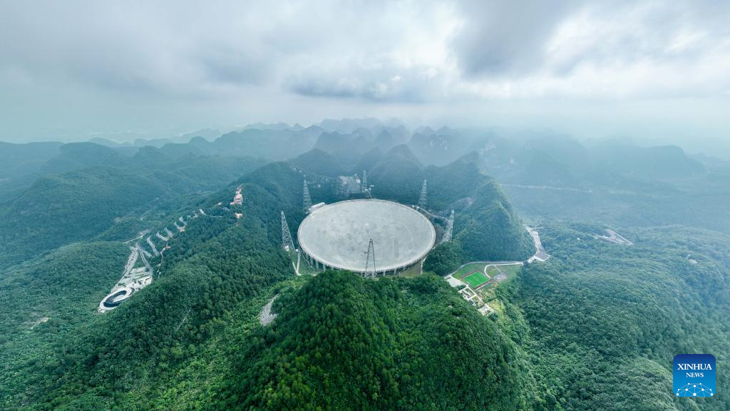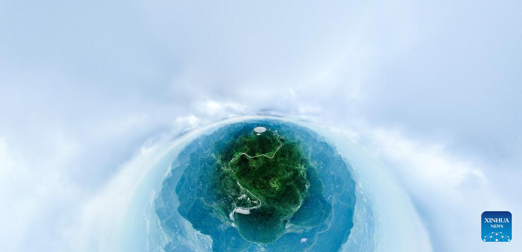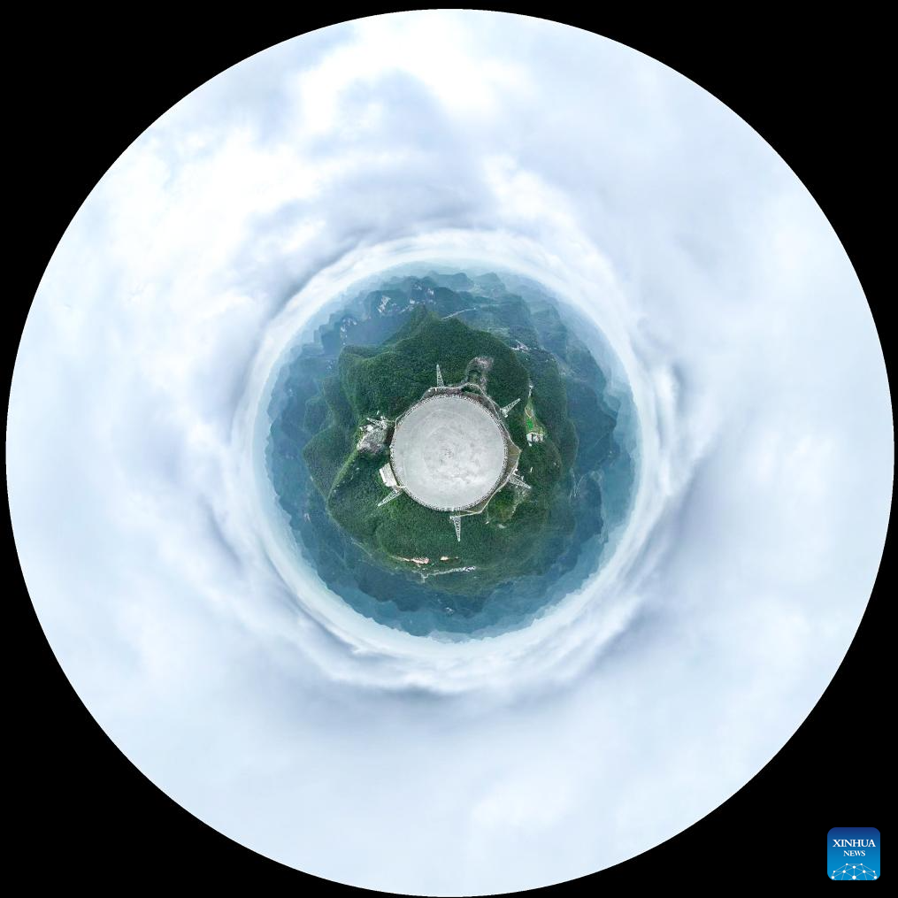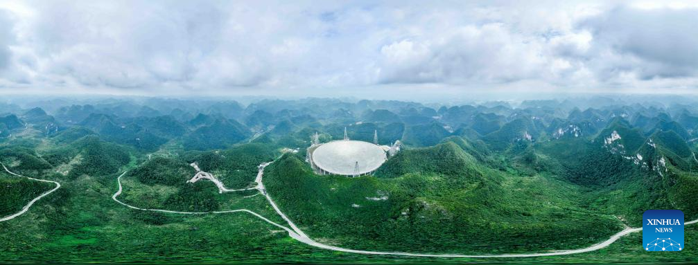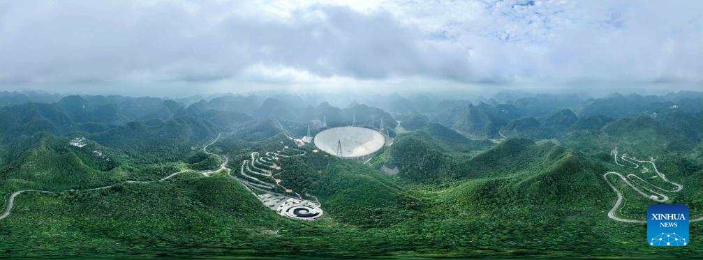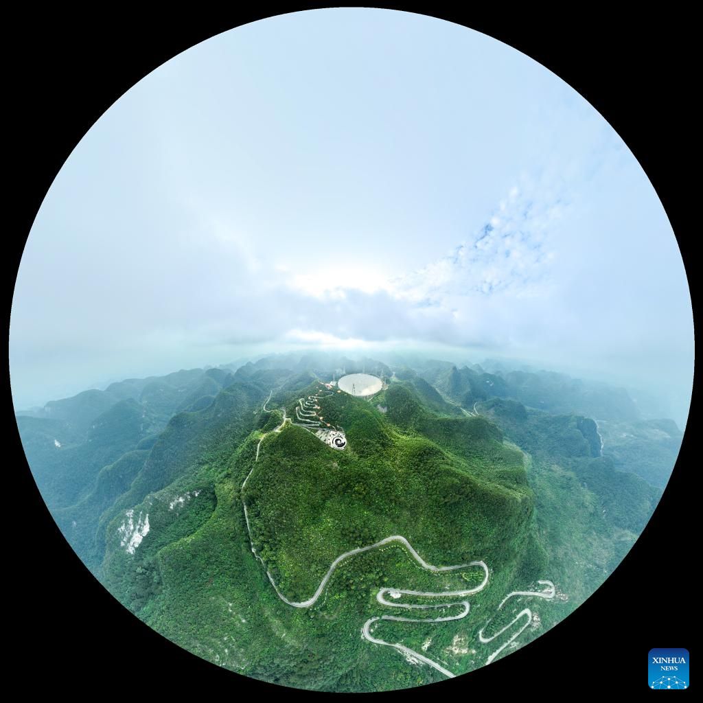 This aerial panoramic photo taken on July 26, 2023 shows China's Five-hundred-meter Aperture Spherical Radio Telescope (FAST) in southwest China's Guizhou Province. An international research team led by Chinese astronomers revealed the complex dynamic features of relativistic jets of a black hole, according to a study published in the journal Nature.