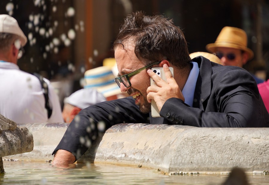A man refreshes himself with the water from a fountain near the Pantheon in Rome, Italy, on July 18, 2023. (Xinhua/Jin Mamengni)