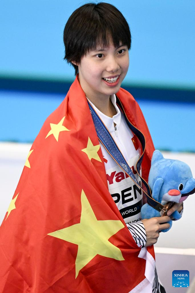 Bronze medalist Peng Xuwei of China reacts after the women's 200m backstroke final at the World Aquatics Championships in Fukuoka, Japan, July 29, 2023. (Xinhua/Xu Chang)