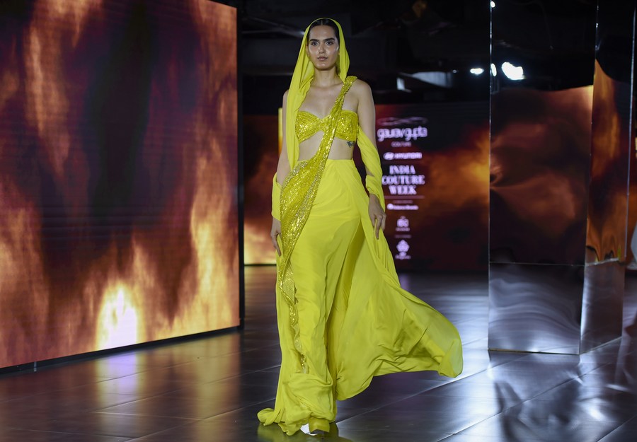 A model displays a creation by Indian designer Gaurav Gupta during the FDCI India Couture Week 2023 in New Delhi, India, on July 27, 2023. (Photo by Javed Dar/Xinhua)