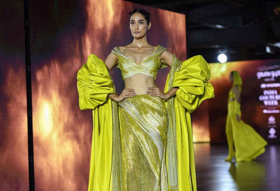 A model displays a creation by Indian designer Gaurav Gupta during the FDCI India Couture Week 2023 in New Delhi, India, on July 27, 2023. (Photo by Javed Dar/Xinhua)■