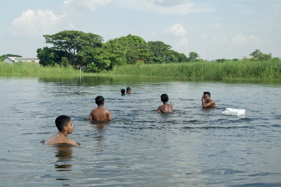 Children swim in a clear lake in Dasherkandi village on the southeast of Dhaka, Bangladesh, on July 24, 2023. (Xinhua)