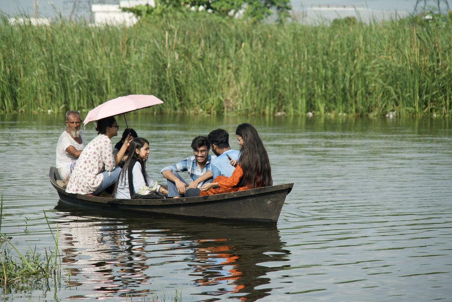 People go boating on a clear lake in Dasherkandi village in the southeast of Dhaka, Bangladesh, on July 24, 2023. (Xinhua)