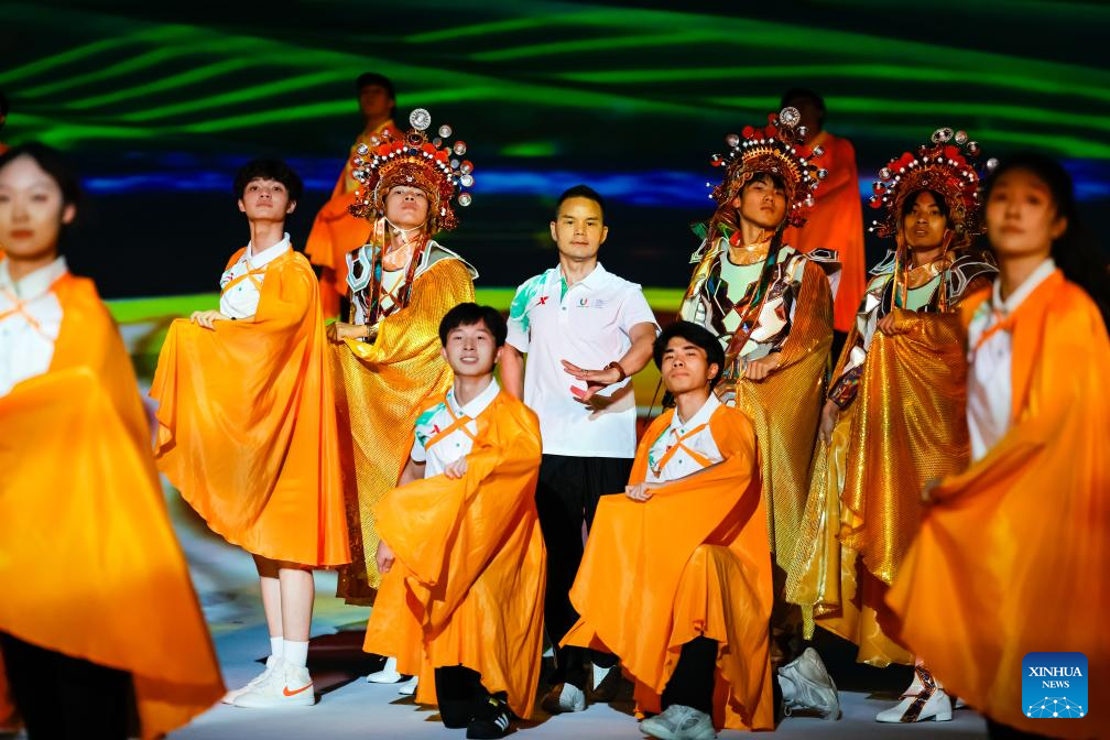 Ren Xin (3rd R, front) performs with other "bian lian" performers during an opening ceremony rehearsal in Chengdu of southwest China's Sichuan Province, on July 23, 2023. Ren Xin, a 19-year-old college student, was fascinated with dancing since her childhood. She was one of the actors and actresses who performed the traditional "bian lian", or face-changing during the opening ceremony of the 31st FISU Summer World University Games in Chengdu on July 28, 2023.