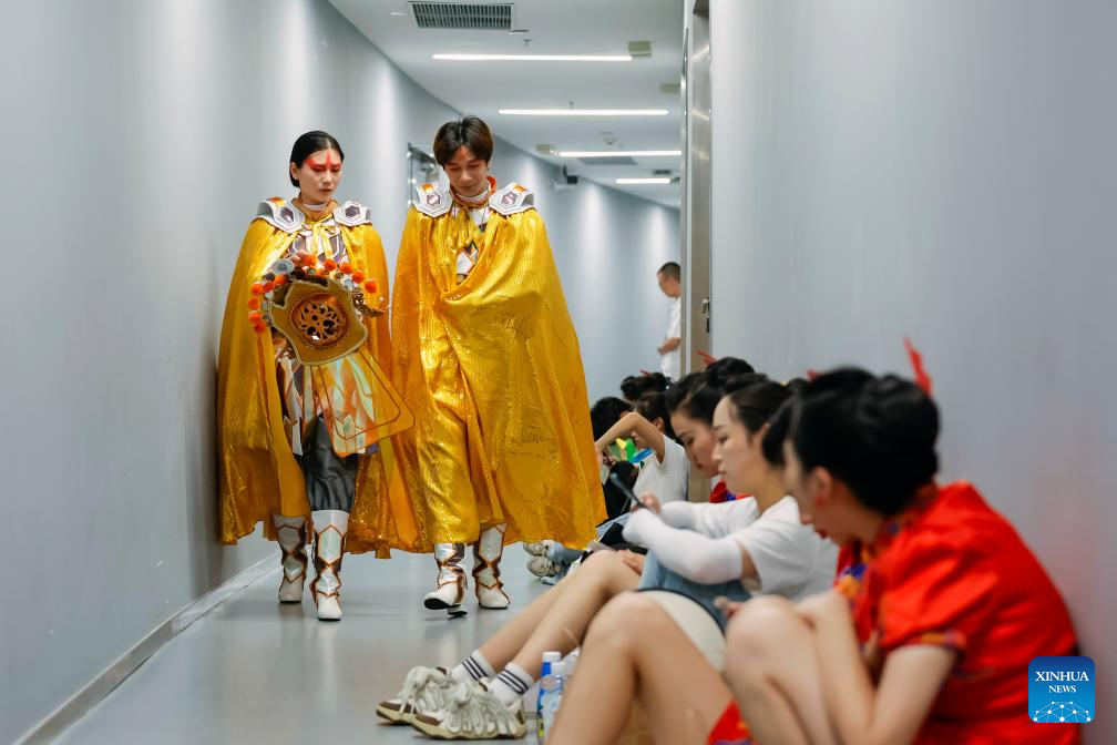 Ren Xin (C) changes her headwear behind a folding screen prior to an opening ceremony rehearsal in Chengdu of southwest China's Sichuan Province, on July 23, 2023. Ren Xin, a 19-year-old college student, was fascinated with dancing since her childhood. She was one of the actors and actresses who performed the traditional "bian lian", or face-changing during the opening ceremony of the 31st FISU Summer World University Games in Chengdu on July 28, 2023.