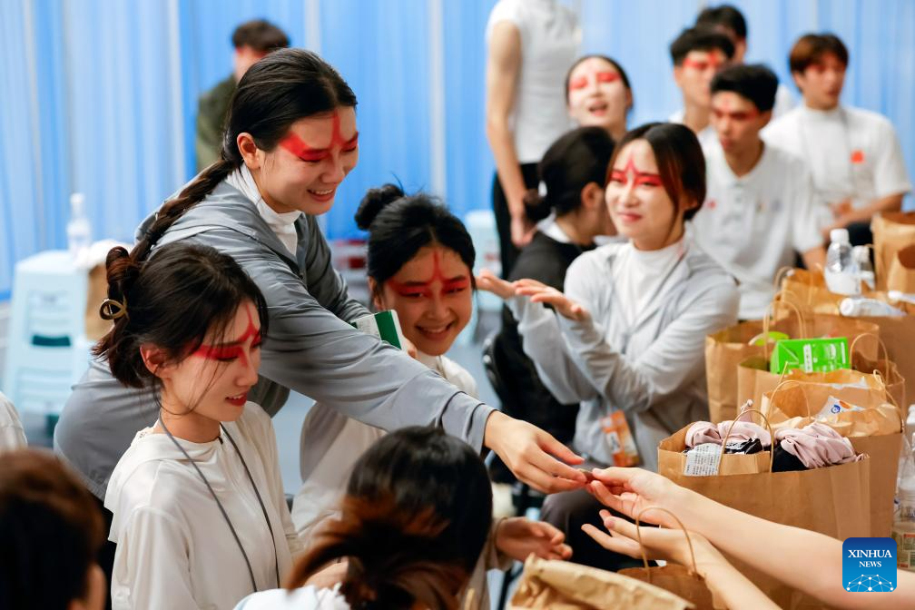 Ren Xin (L top) distributes sunstroke prevention medications to other "bian lian" performers prior to an opening ceremony rehearsal in Chengdu of southwest China's Sichuan Province, on July 23, 2023. Ren Xin, a 19-year-old college student, was fascinated with dancing since her childhood. She was one of the actors and actresses who performed the traditional "bian lian", or face-changing during the opening ceremony of the 31st FISU Summer World University Games in Chengdu on July 28, 2023.