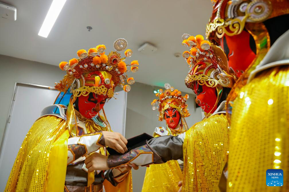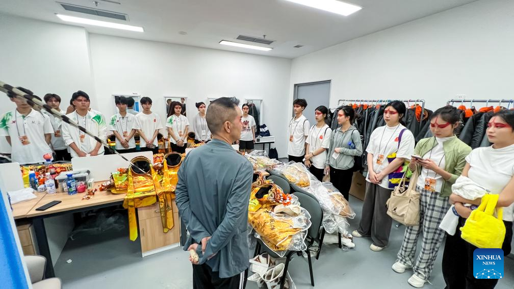 Ren Xin (1st L) helps other "bian lian" performers check their costumes prior to an opening ceremony rehearsal in Chengdu of southwest China's Sichuan Province, on July 23, 2023. Ren Xin, a 19-year-old college student, was fascinated with dancing since her childhood. She was one of the actors and actresses who performed the traditional "bian lian", or face-changing during the opening ceremony of the 31st FISU Summer World University Games in Chengdu on July 28, 2023.