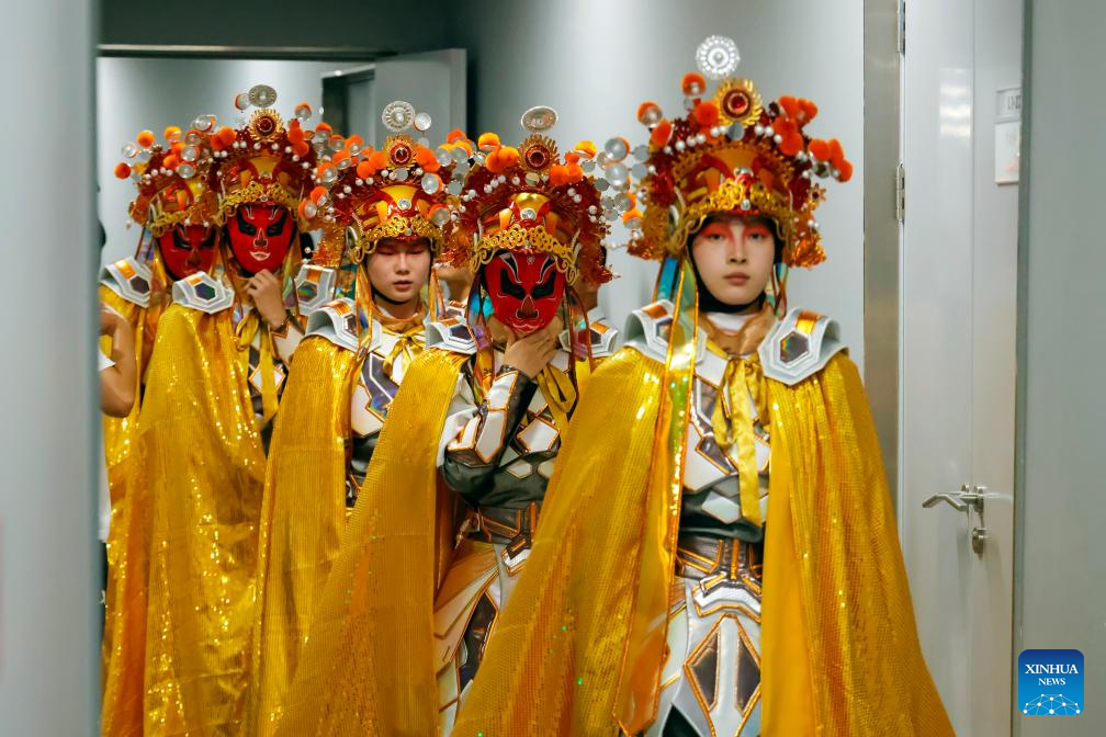 Ren Xin (3rd R) and other "bian lian" performers wait prior to an opening ceremony rehearsal in Chengdu of southwest China's Sichuan Province, on July 23, 2023. Ren Xin, a 19-year-old college student, was fascinated with dancing since her childhood. She was one of the actors and actresses who performed the traditional "bian lian", or face-changing during the opening ceremony of the 31st FISU Summer World University Games in Chengdu on July 28, 2023.