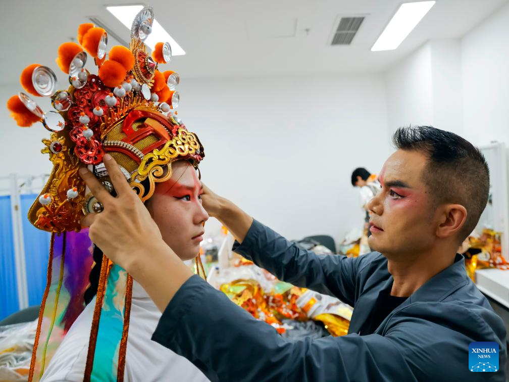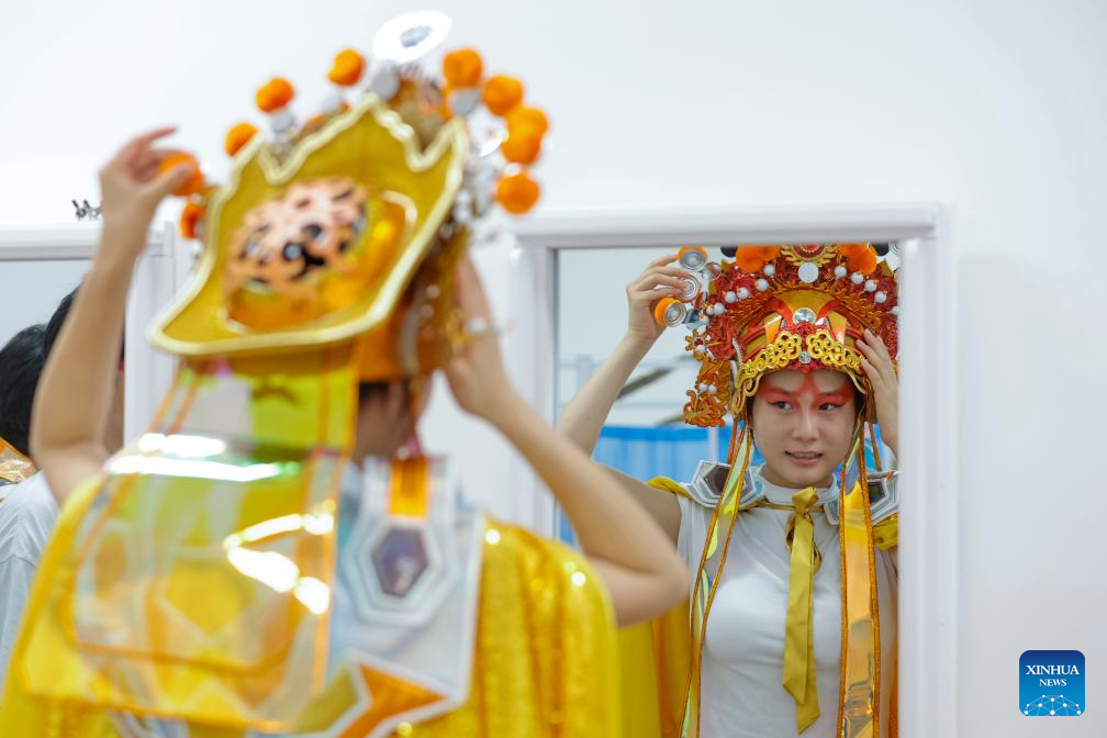 Ren Xin adjusts her headwear prior to an opening ceremony rehearsal in Chengdu of southwest China's Sichuan Province, on July 23, 2023. Ren Xin, a 19-year-old college student, was fascinated with dancing since her childhood. She was one of the actors and actresses who performed the traditional "bian lian", or face-changing during the opening ceremony of the 31st FISU Summer World University Games in Chengdu on July 28, 2023.