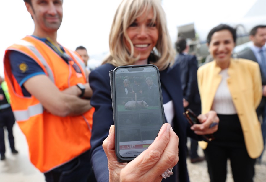 Brigitte Macron, wife of French President Emmanuel Macron, displays a photo of her with four-month-old giant panda Yuan Meng at the Roissy Charles-de-Gaulle airport, near Paris, France, July 25, 2023. (Xinhua/Gao Jing)