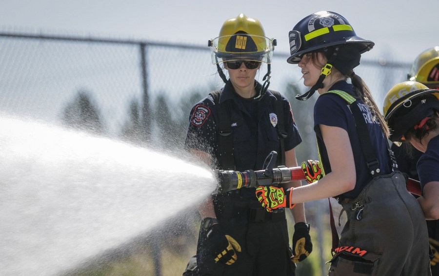 A student learns how to use a fire hose during the firefighter training camp at a fire department's training facility in Vancouver, British Columbia, Canada, on Aug. 5, 2022. (Photo by Liang Sen/Xinhua)