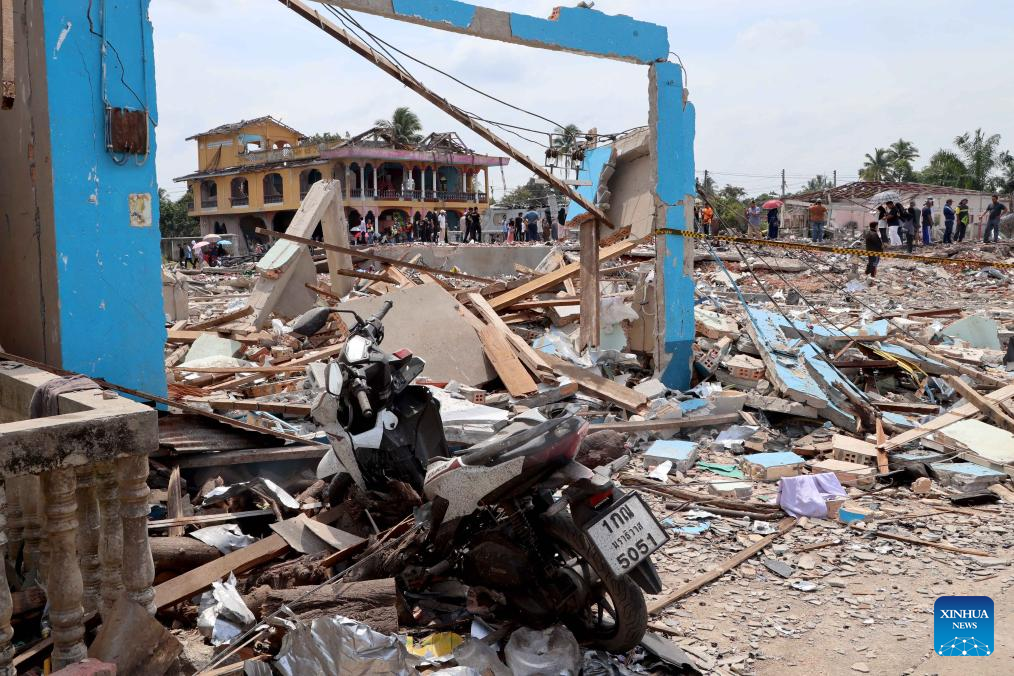 This photo taken on July 30, 2023 shows the scene of explosion in Narathiwat, Thailand. At least 10 people were killed and more than 100 were injured after a fireworks warehouse exploded in southern Thailand on Saturday, government officials said. The explosion, which occurred in the afternoon, destroyed some 10 houses and partially damaged about 100 houses in a market in Narathiwat province bordering Malaysia, said Deputy Government Spokesperson Ratchada Thanadirek. (Xinhua)